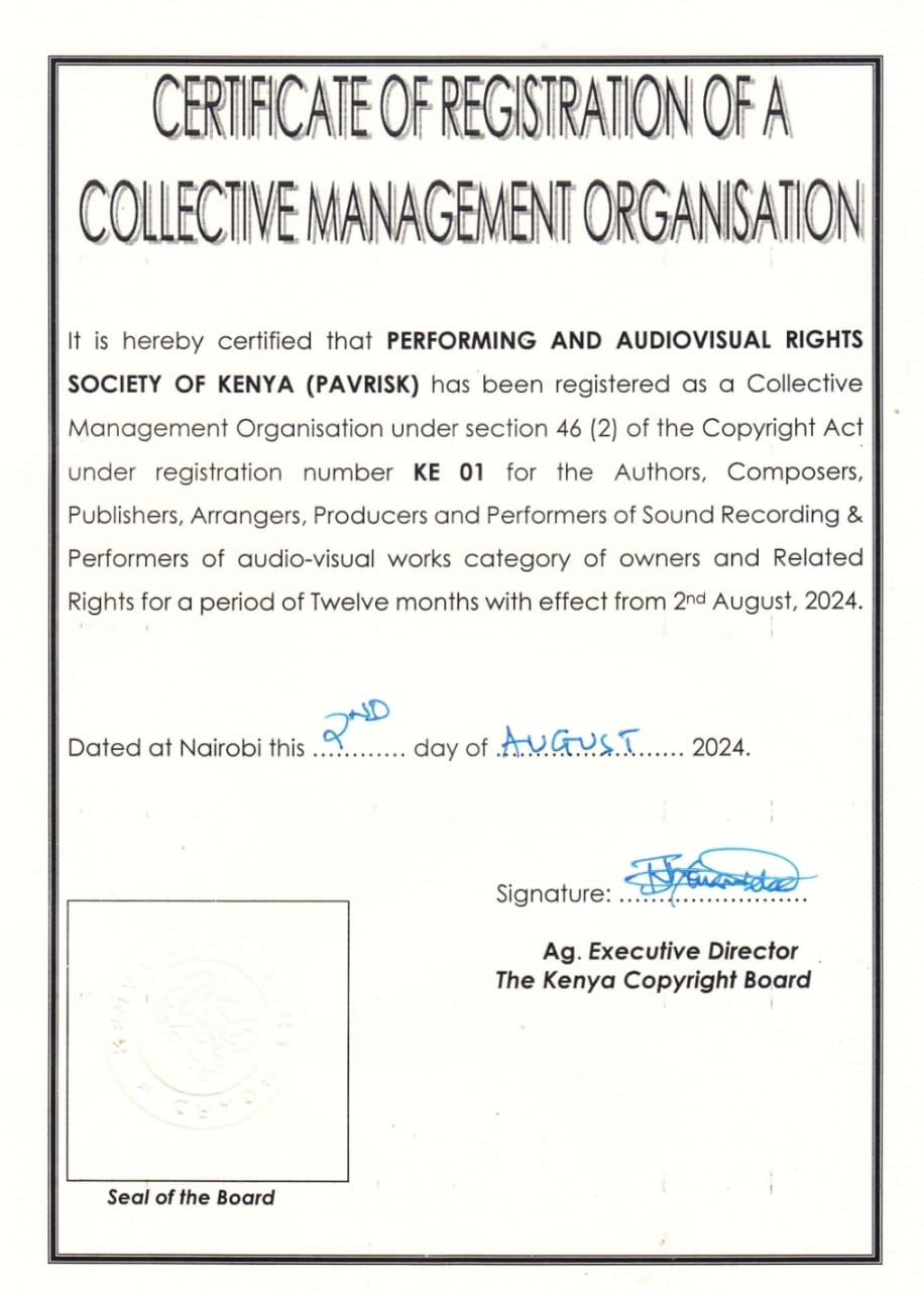 Performing and Audio Visual Rights Society of Kenya (PAVRISK) is a not-for-profit company limited by guarantee incorporated under the Companies Act 2015, Laws of Kenya. It is registered and licensed by the Kenya Copyright Board (KECOBO) as the single ‘’one-stop’’ multi-rights organization in line with Section 46 of the Copyright Act no. 12 of 2001, to carry out the functions of a Collective Management Organization (CMO) in the Republic of Kenya. PAVRISK is registered and licensed as a CMO representative of all Music rights that include Authors, Composers/arrangers, Publishers, Performers and Producers of Sound recordings on one part, and the Audio-visual works creators that include Producers, Script writers and Actors of dramatic works, on the other. Additionally, PAVRISK has also been allowed to administer on appointment basis, all the economic rights in relation to the works of reprography in Kenya (Book publishers) and the rights administration in the visual arts category.
